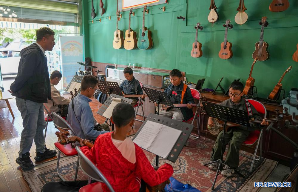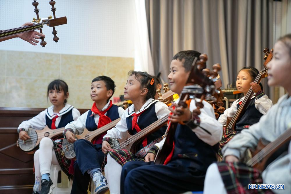 지난 11일 시짱(西藏)자치구 라싸(拉薩)시 실험초등학교에서 아이들이 짱(藏)족 전통 악기인 자녠(扎念)금(琴)을 연주하고 있다.