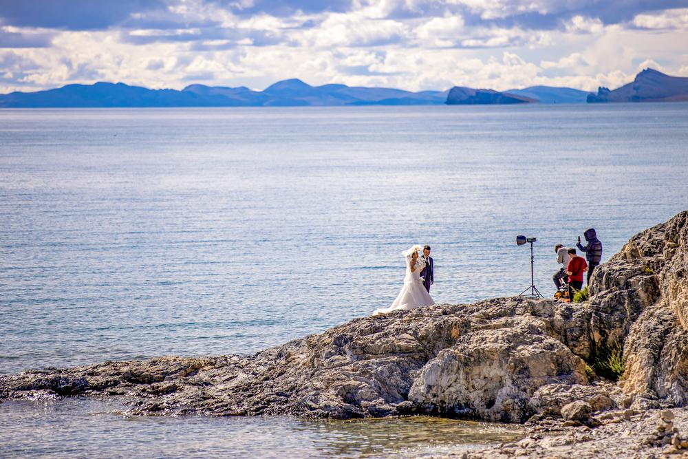 16일 시짱자치구 나무춰 호숫가에서 웨딩촬영 중인 관광객. 2025.9.17
