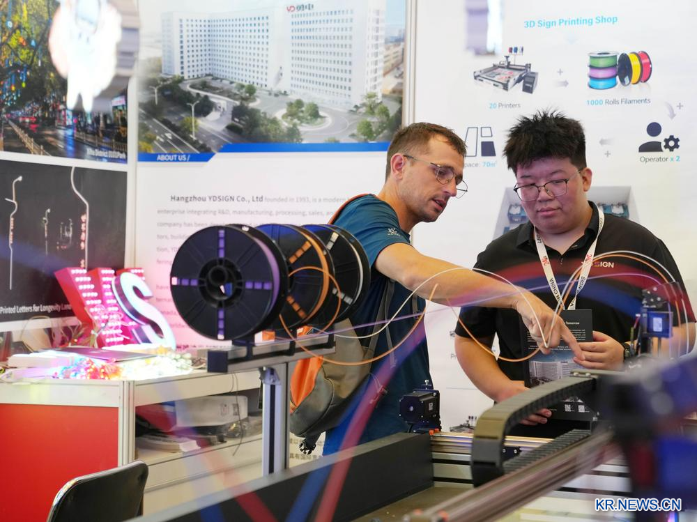 17일 '제26회 상하이 국제 광고전시회'를 찾은 관람객이 광고간판 제작용 3D 프린터 장비를 살펴보고 있다.