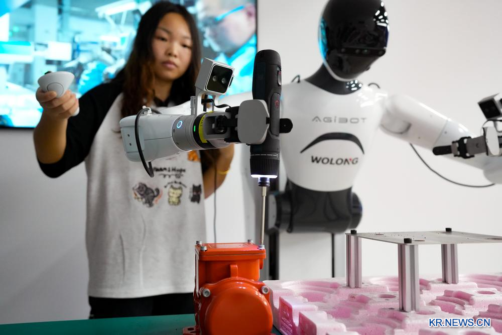 [신화망 사오싱 9월24일] 저장(浙江)성 사오싱(紹興)시 상위(上虞)구에 위치한 항저우완(杭州灣) 임바디드 AI 혁신센터에서는 실제 작업 프로세스에 맞춰 데이터 수집 시나리오를 구축하고 로봇 작업 모델 훈련을 시행하고 있다. 이는 로봇이 바로 생산라인에 투입될 수 있도록 하기 위함이다.