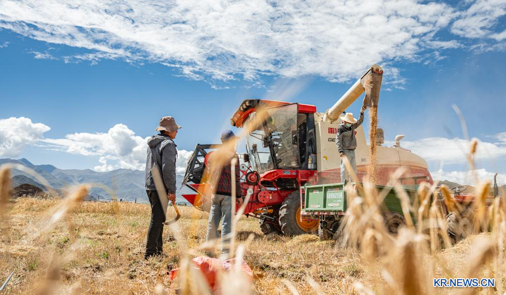 23일 시짱 라싸 린저우현 강바(岗巴)촌에서 농민이 농기계로 칭커(青稞)를 수확하고 있다.
