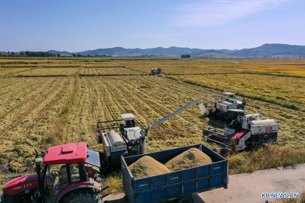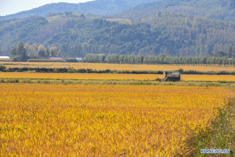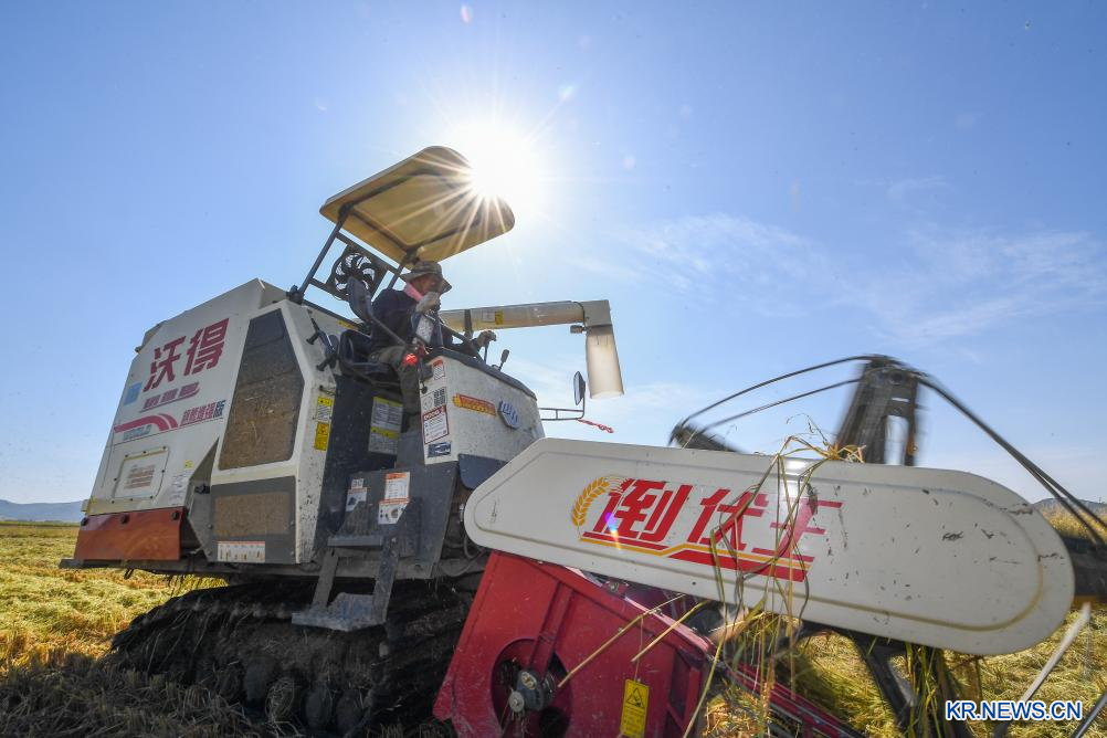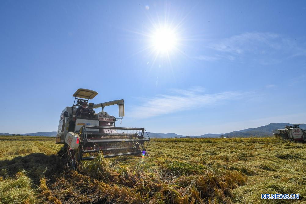 23일 지린성 지린시 융지현에서 농기계로 벼를 수확하고 있는 농민.