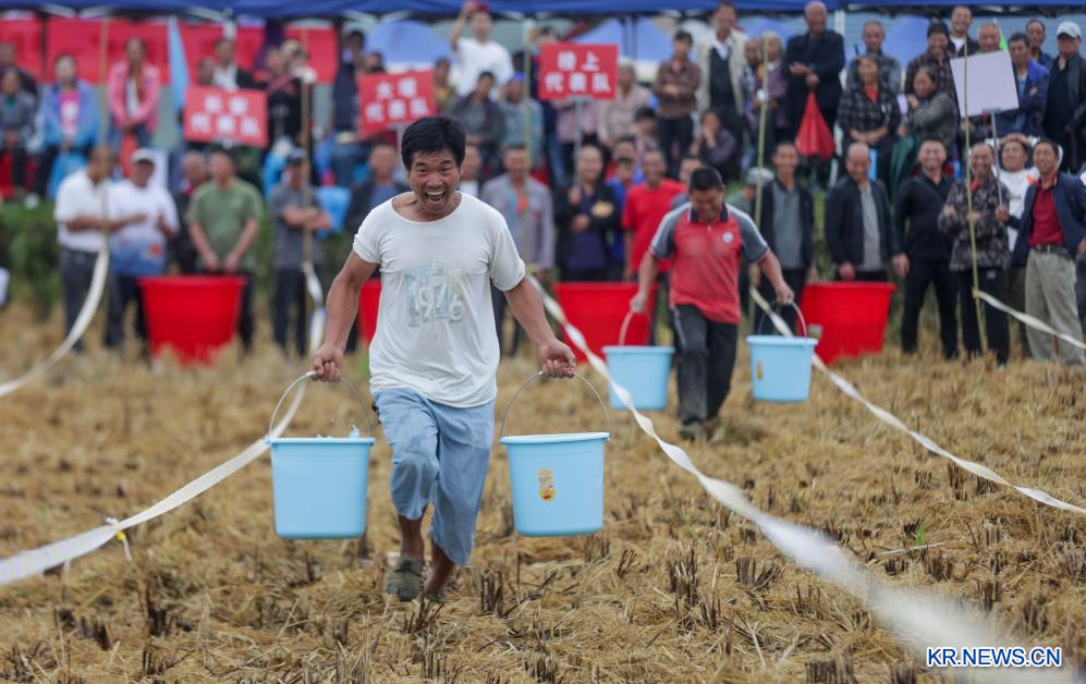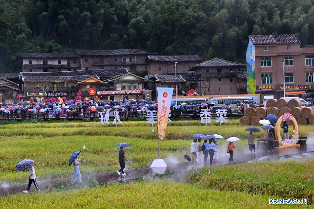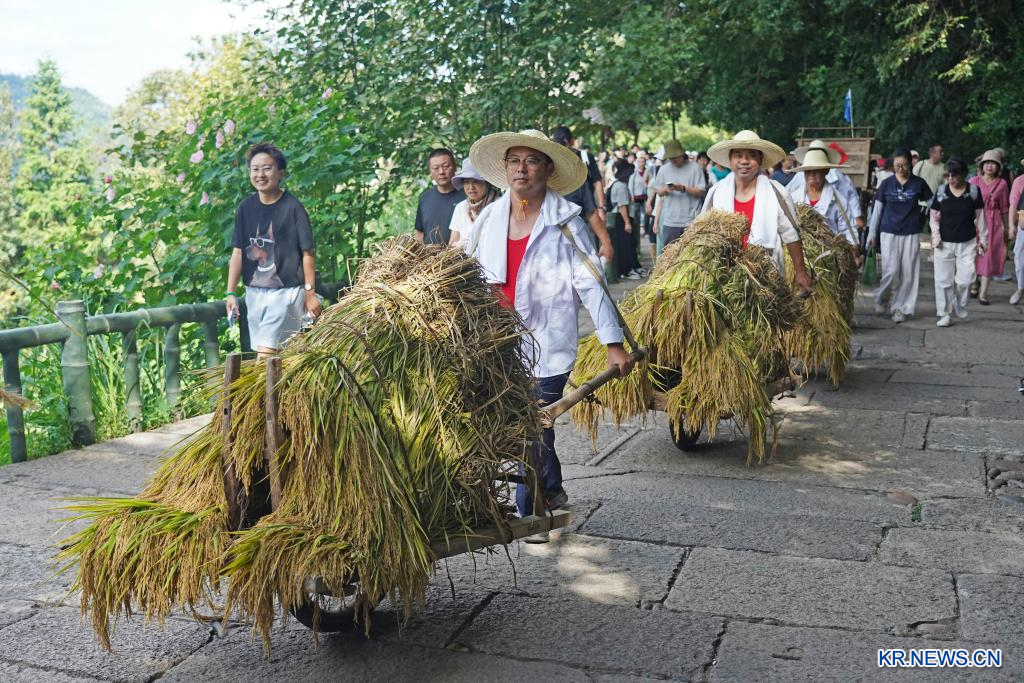 23일 장시 우위안 황링풍경구에서 추수 퍼레이드를 하고 있는 농민.