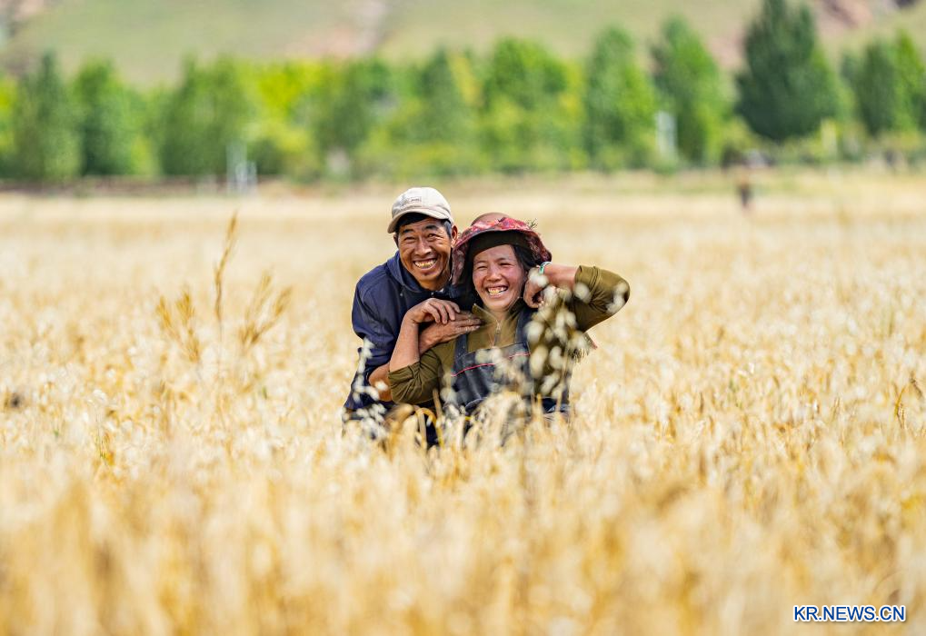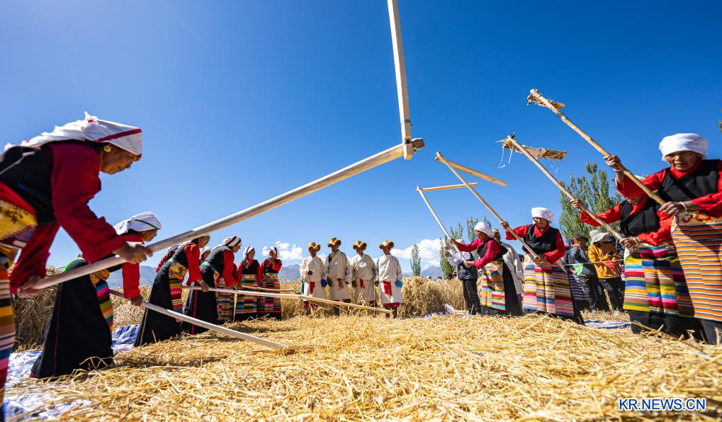 23일 시짱 라싸 린저우(林周)현 쑹판(松盘)향 강바촌에서 추수의 기쁨을 만끽하는 농민.