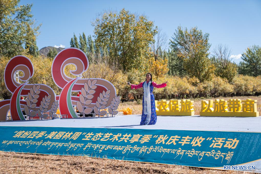 23일 시짱 라싸 린저우현 창가향 뎬충촌에서 현지 농민이 노래와 춤으로 추수의 기쁨을 만끽했다.