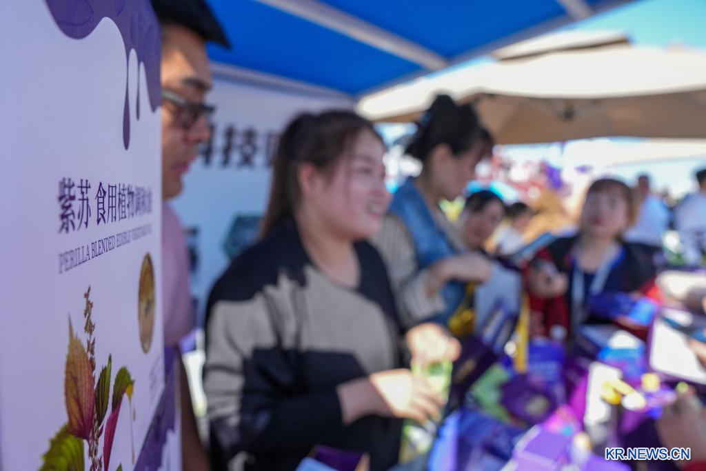 23일 헤이룽장성 자무쓰시 화난(樺南)현에서 열린 축하 행사 현장에서 상품를 소개하는 업체 관계자.