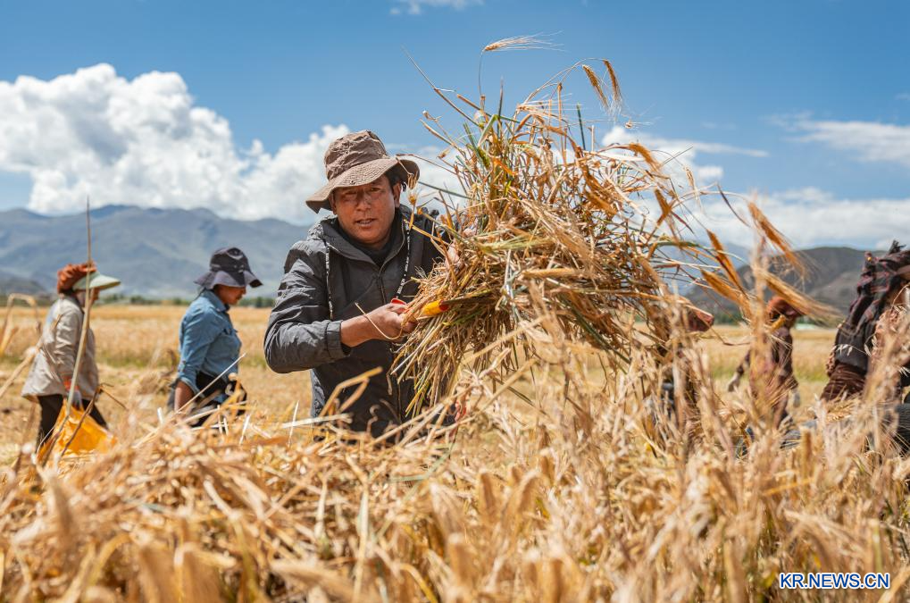 23일 시짱 라싸 린저우현 강바촌에서 칭커를 수확하는 농민.