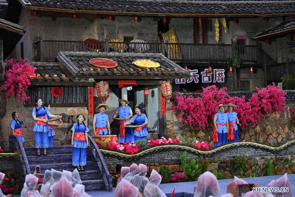23일 푸젠 푸톈(莆田)시 셴여우(仙游)현 차이시(菜溪)향 샹싱촌에서 열린 행사 현장에서 공연하는 배우들.