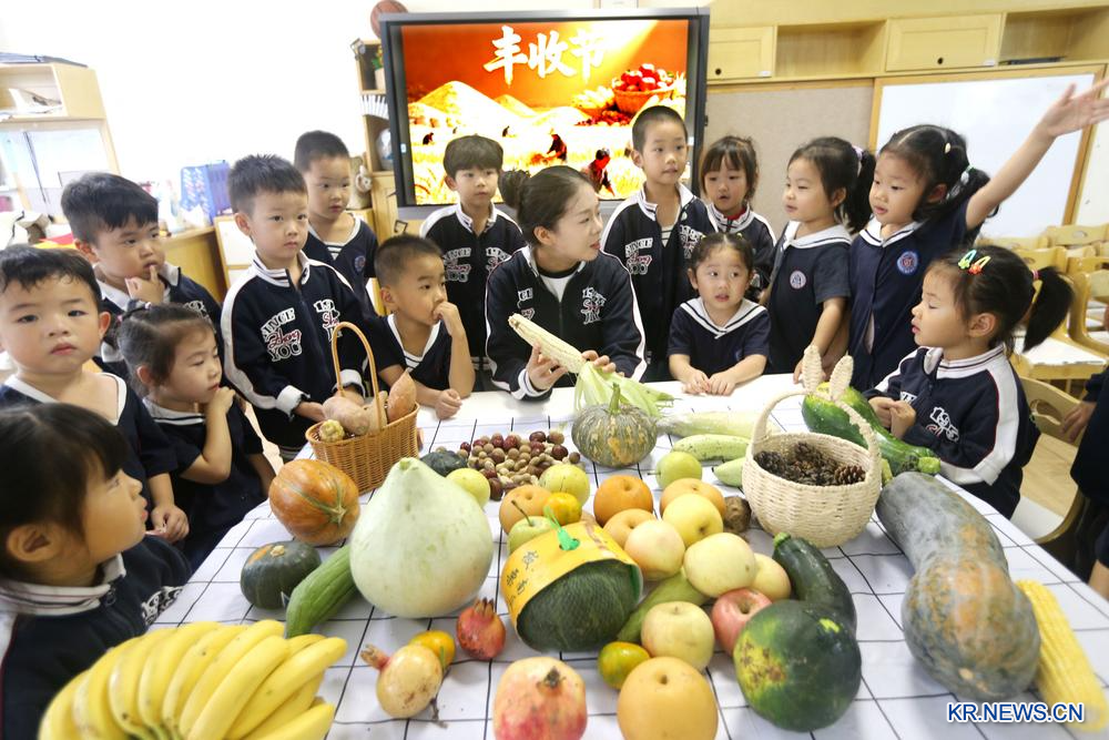 23일 장쑤(江蘇)성 롄윈강(連雲港)시의 한 유치원에서 교사가 어린이들에게 식량 관련 지식을 알려주고 있다.