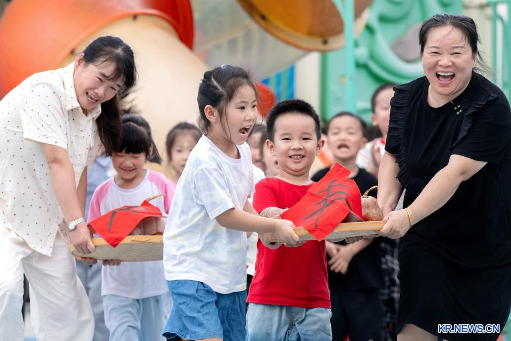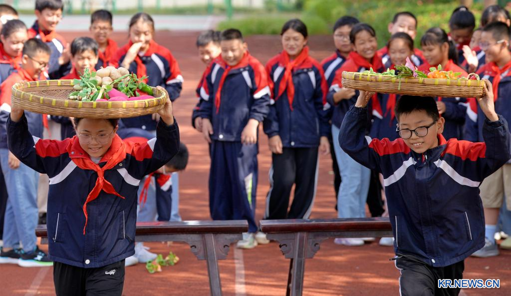 23일 장쑤성 하이안(海安)시의 한 초등학교에서 식량 나르기 경기에 참가한 학생들.