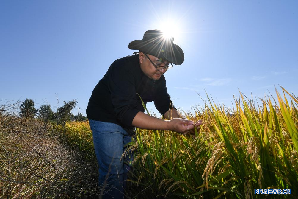23일 지린성 지린시 융지현 차루허진에서 벼 작황을 살피는 관계자.