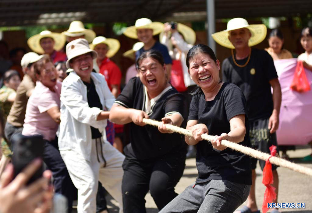 23일 광시 허저우(賀州)시에서 열린 행사에서 줄다리기 경기에 참가한 농민들.