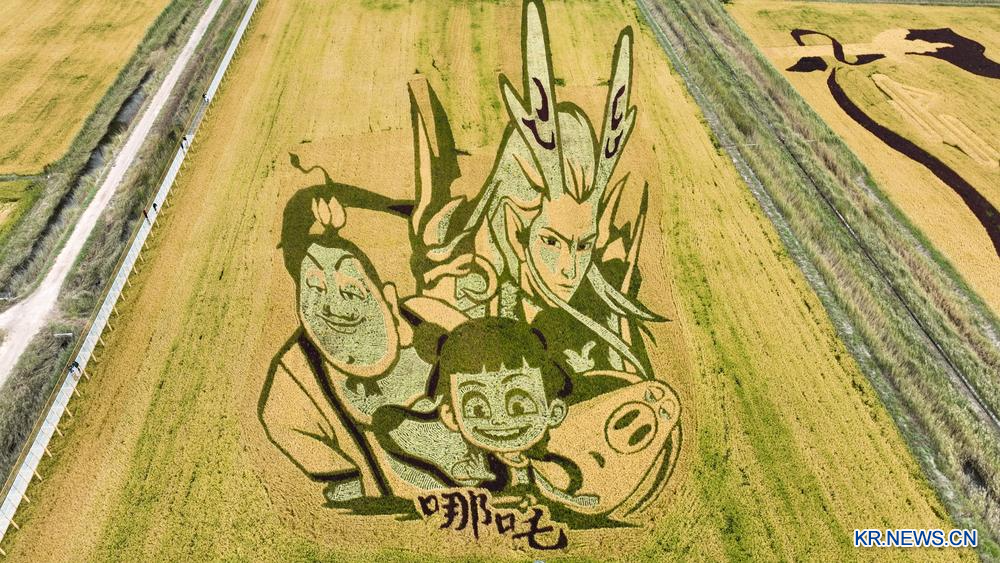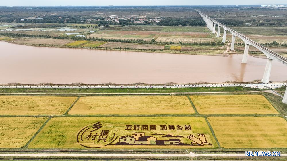 [신화망 어얼둬쓰 9월24일] 22일 네이멍구(內蒙古)자치구 어얼둬쓰(鄂爾多斯)시 준거얼(準格爾)기의 황허(黃河) 기슭에 조성된 논 그림을 드론 사진으로 내려다봤다.