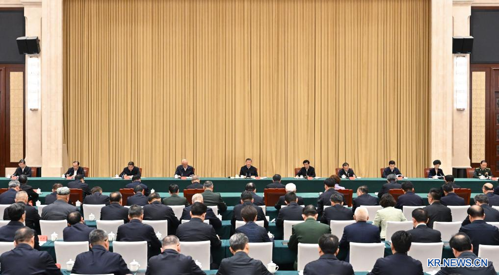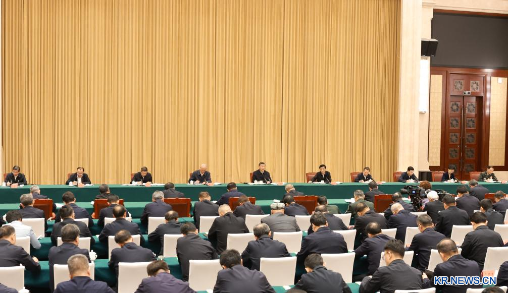 중앙대표단을 이끌고 신장위구르자치구 설립 70주년 경축행사에 참석한 시진핑(習近平) 중국 공산당 중앙위원회 총서기, 국가주석, 중앙군사위원회 주석은 24일 오후 우루무치(烏魯木齊)에서 신장위구르자치구 당위원회와 정부의 업무 보고를 청취하고 중요 연설을 했다.[촬영/신화사 기자 셰환츠(謝環馳)]