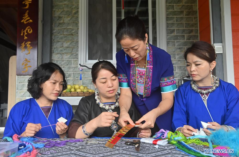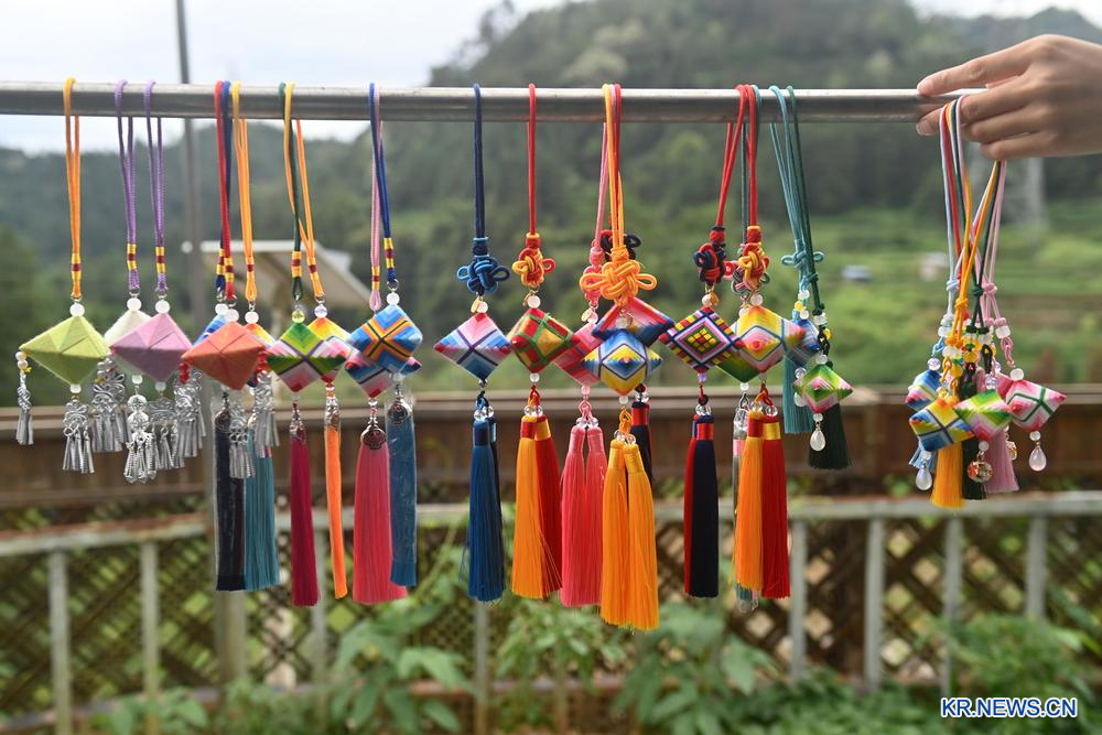[신화망 싼장 9월26일] 둥(侗)족 길상화(吉祥花)는 광시(廣西)좡족자치구 싼장(三江)둥족자치현의 전통 수공예품으로 둥족의 염색, 자수, 비단 짜기 등 기법이 녹아있다. 최근 수년간 싼장현이 문화관광 상품을 적극 개발하면서 둥족 길상화는 문화관광 시장에서 좋은 판매고를 올리고 있다.