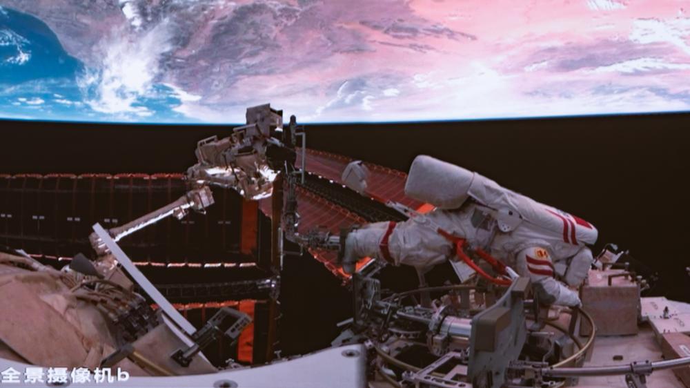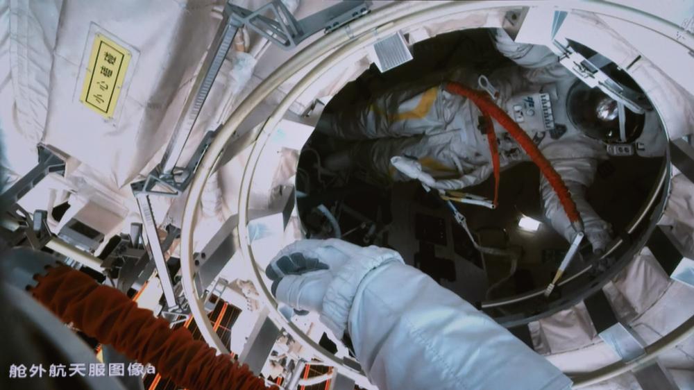 선저우 20호 우주인 왕제(王傑)가 선외 임무를 수행하고 있는 모습이 25일 저녁 베이징우주통제센터(BACC)에서 포착됐다. 2025.9.26