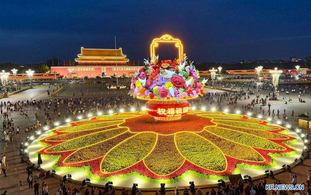 25일 베이징 톈안먼(天安門) 광장에 '축복조국(祝福祖國)'이 새겨진 대형 꽃바구니가 등장했다. 높이 18m의 해당 꽃바구니는 '화목과 아름다움'을 뜻하는 연꽃, '영광과 평화'를 뜻하는 올리브 가지, 평화를 상징하는 비둘기 모형 등으로 장식됐다.