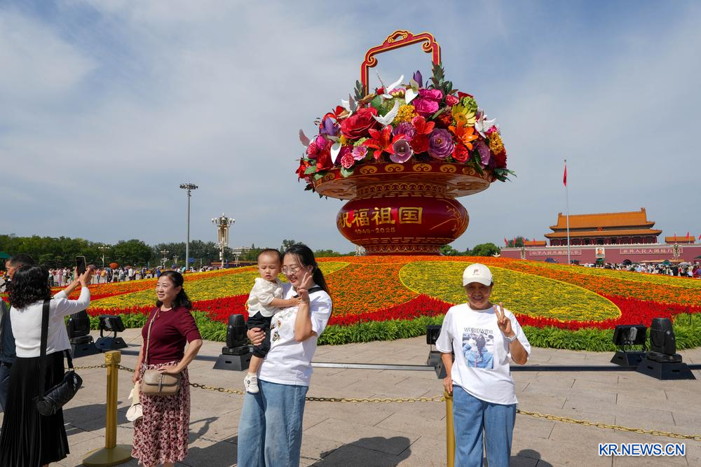 [신화망 베이징 9월26일] 관광객이 25일 베이징 톈안먼(天安門) 광장에 설치된 대형 꽃바구니를 배경으로 기념사진을 찍고 있다.