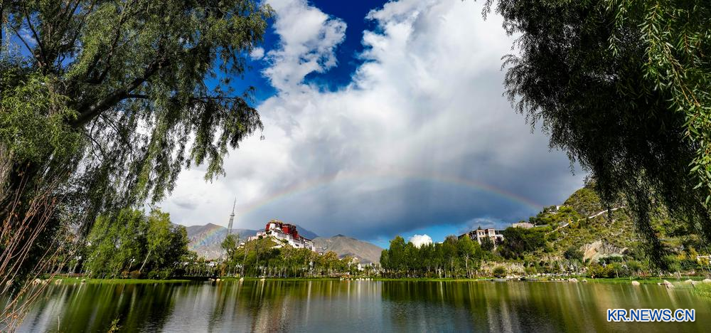 21일 라싸 퇀제공원에서 바라본 무지개 아래 포탈라궁. 2025.9.25