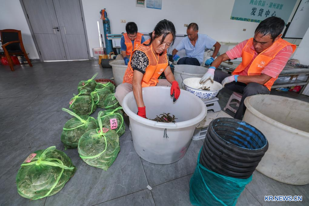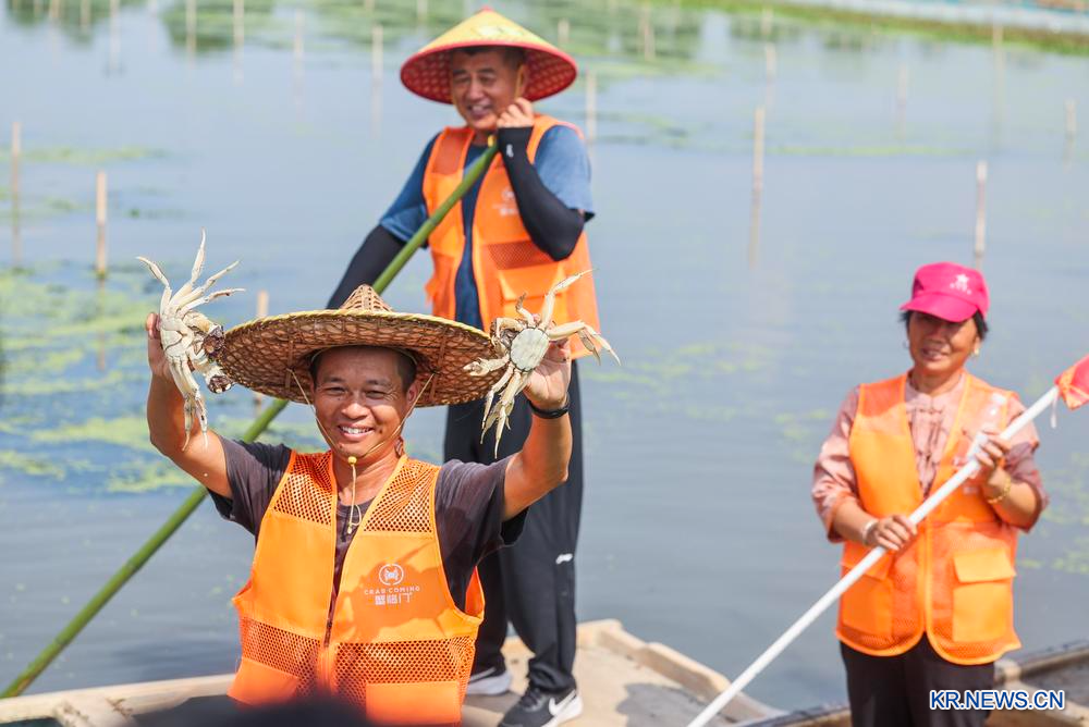 26일 저장(浙江)성 후저우(湖州)시에 위치한 셰린먼(蟹臨門)농업테크회사의 참게 양식장에서 양식업자가 갓 잡은 게를 들어 보이고 있다.26일 저장(浙江)성 후저우(湖州)시 우싱(吳興)구 즈리(織里)진에서 '후저우 셰린먼(蟹臨門) 참게 축제'가 열렸다. 이번 행사에는 참게 양식 관련 업체 53개와 양식업자 200여 명이 참가했다. 즈리진 참게 양식 면적은 6.7㎢에 달한다. 연간 생산액은 3억 위안(약 591억원), 약 1천 개의 일자리를 창출하고 있다.