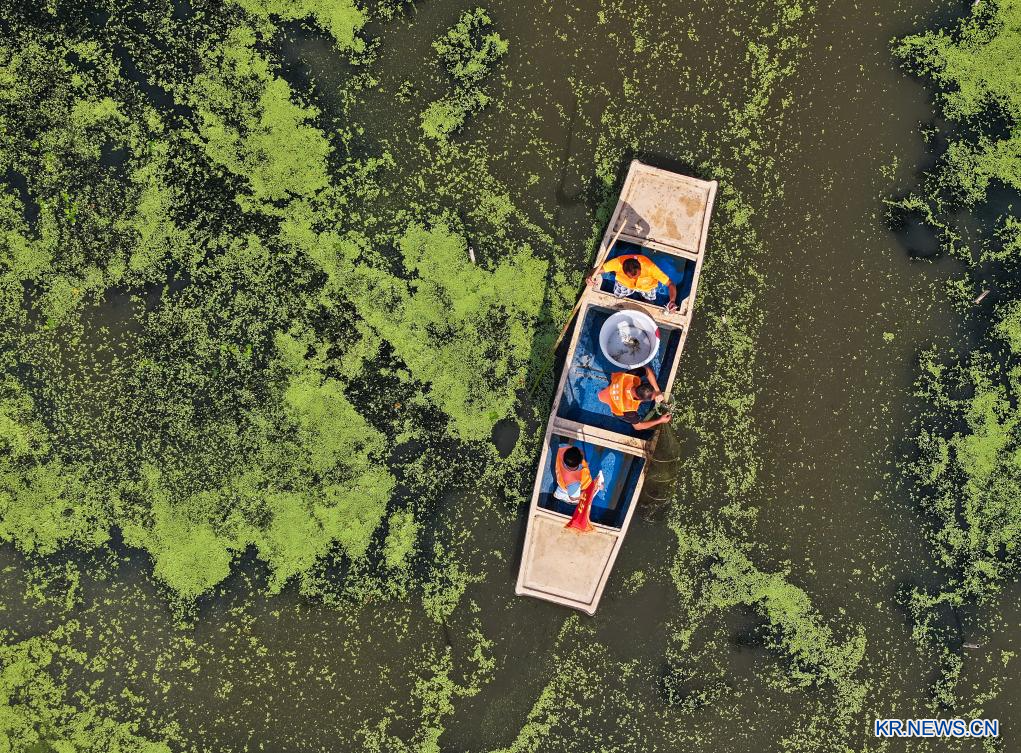 이날 후저우 즈리진 한 참게 양식장에서 양식업자가 참게를 잡고 있다. 2025.9.26