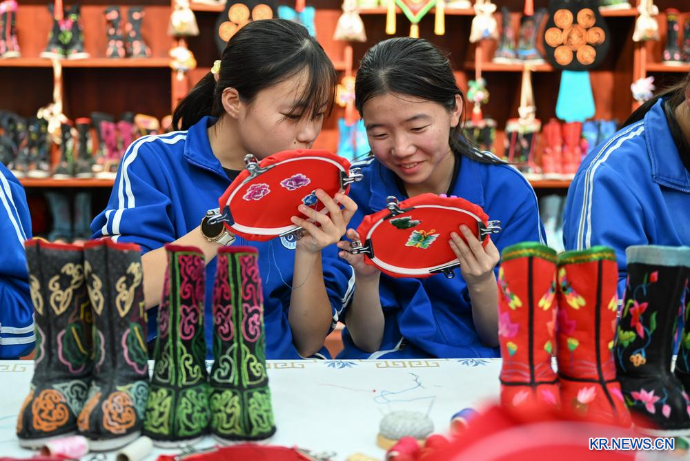 26일 전통 자수를 배우는 네이멍구(內蒙古)자치구 싱안(興安)맹의 바옌후수(巴彥呼舒)제6중학교 학생들.