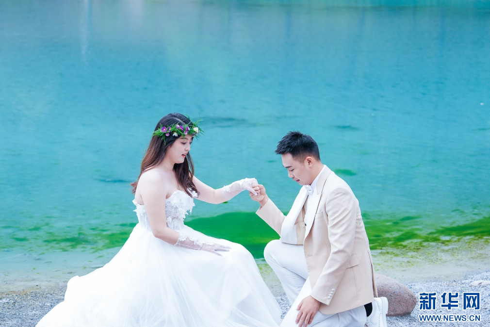 리장 란웨구(藍月谷)에서 웨딩사진을 촬영하는 관광객.