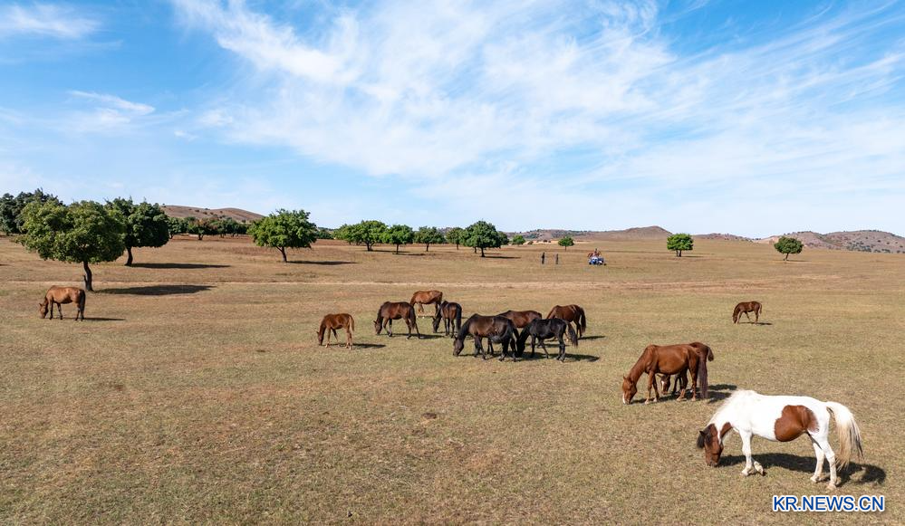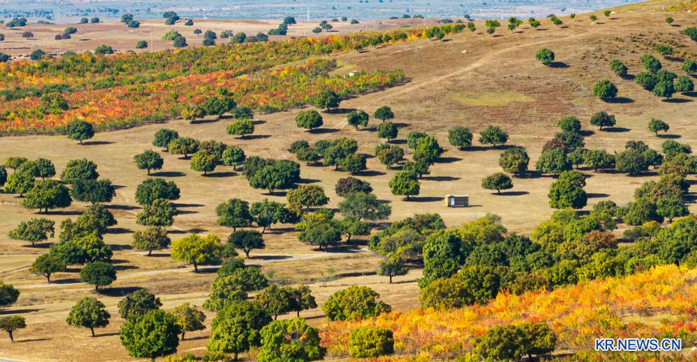 27일 네이멍구(內蒙古)자치구 싱안(興安)맹 커얼친유이중(科尔沁右翼中)기 우자오펑(五角楓) 생태관광지의 가을 풍경을 드론으로 담았다.