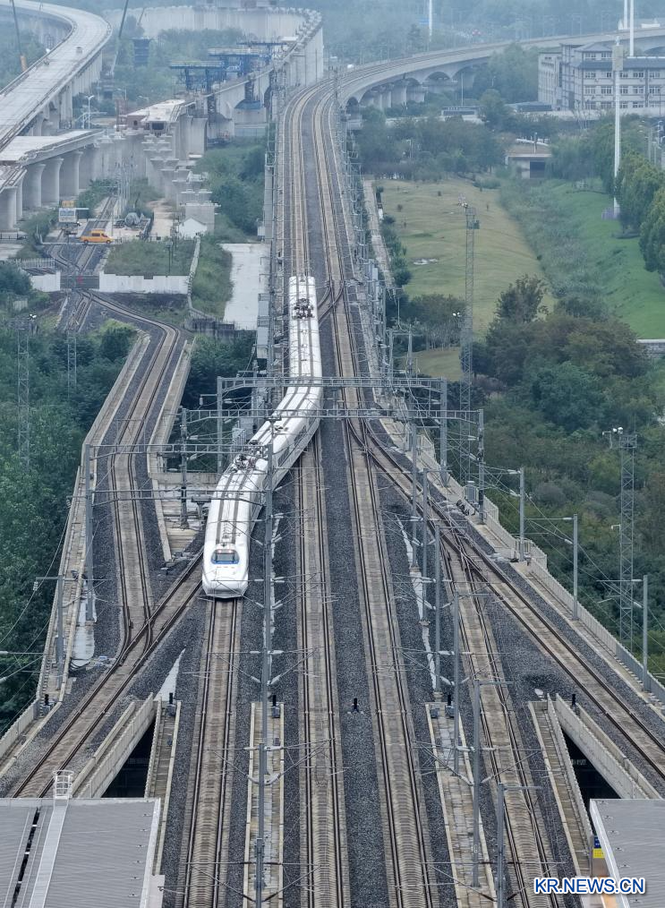 29일 양저우역을 빠져나가는 열차.(드론사진)