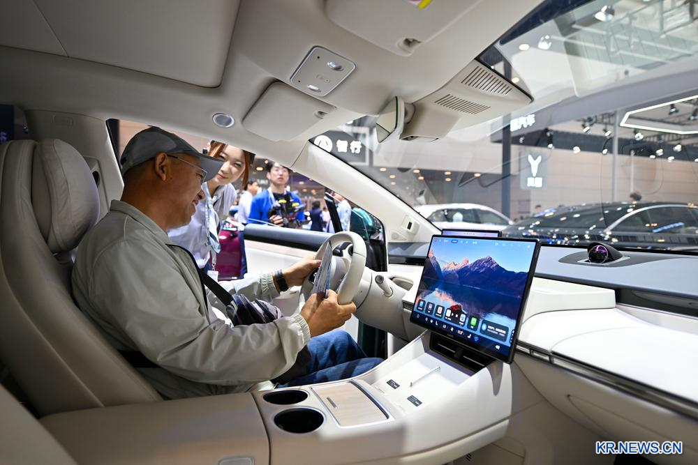 [신화망 톈진 10월1일] 9월 30일 국가컨벤션센터(톈진)에서 한 관람객이 스마트 주행 기능을 갖춘 자동차를 살펴보고 있다.