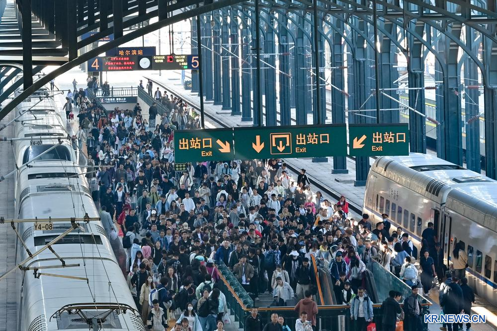 이날 여객들로 북새통을 이룬 하얼빈(哈爾濱)역 승강장. 2025.10.1