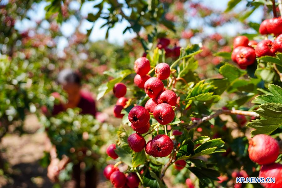 [신화망 지난 10월3일] 가을로 접어든 산둥(山東)성 타이안(泰安) 신타이(新泰)시 류두(劉杜)진. 면적 약 667㏊의 산사나무 숲 옆으로 출발 준비를 마친 화물차들이 대기 중이다.