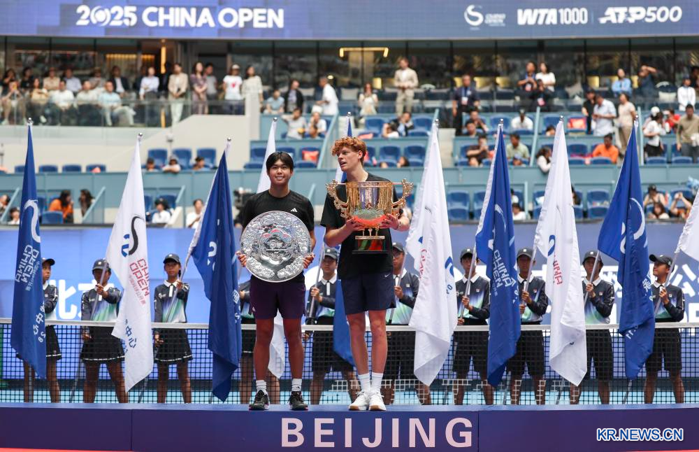 [신화망 베이징 10월2일] 톱시드 야닉 시너(이탈리아)가 1일 베이징에서 열린 2025년 차이나오픈 남자단식 결승에서 우승컵을 들어올렸다. 시너는 19세 신예 러너 티엔(미국)을 6대 2로 꺾고 정상에 올랐다. 시너는 2023 차이나오픈에서 우승을 차지한 바 있다.