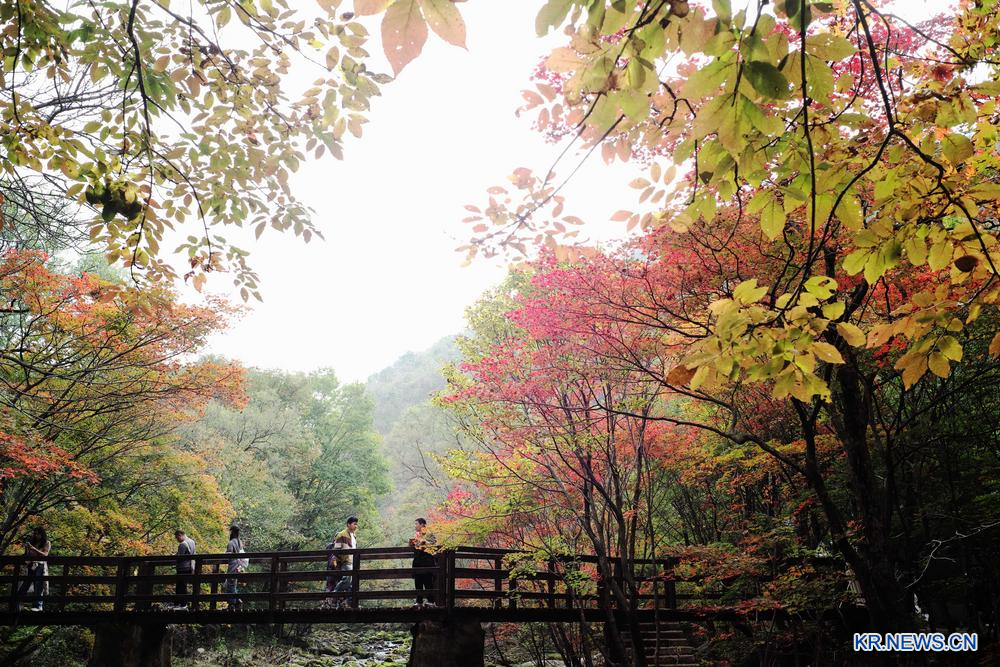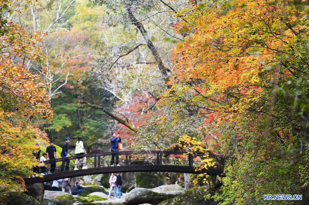 중국 국경절 연휴 기간 랴오닝(遼寧)성 번시(本溪)시에 위치한 라오볜거우(老邊溝)풍경구의 단풍이 오색 빛으로 물들며 관광객의 발길을 끌어모으고 있다.