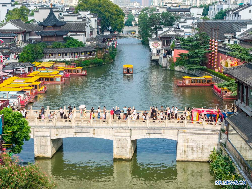 5일 장쑤(江蘇)성 난징(南京)시 푸쯔먀오(夫子廟) 관광지를 찾은 관광객들을 드론으로 내려다봤다. 2025.10.6