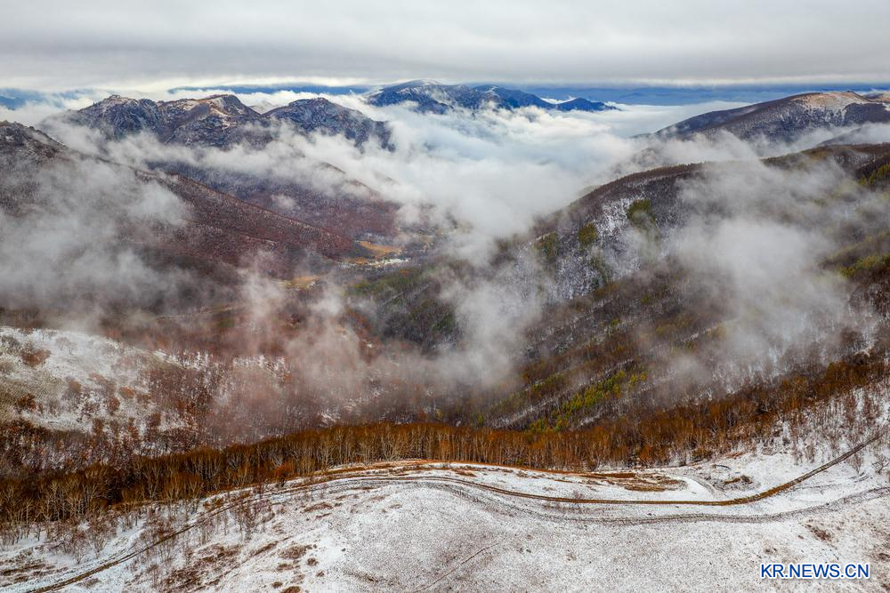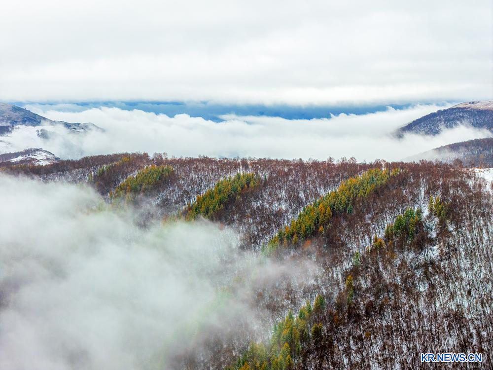 [신화망 츠펑 10월7일] 6일 눈이 내린 네이멍구(內蒙古)자치구 츠펑(赤峰)시 커스커텅(克什克騰)기 황강량(黃崗梁)을 드론으로 내려다봤다.