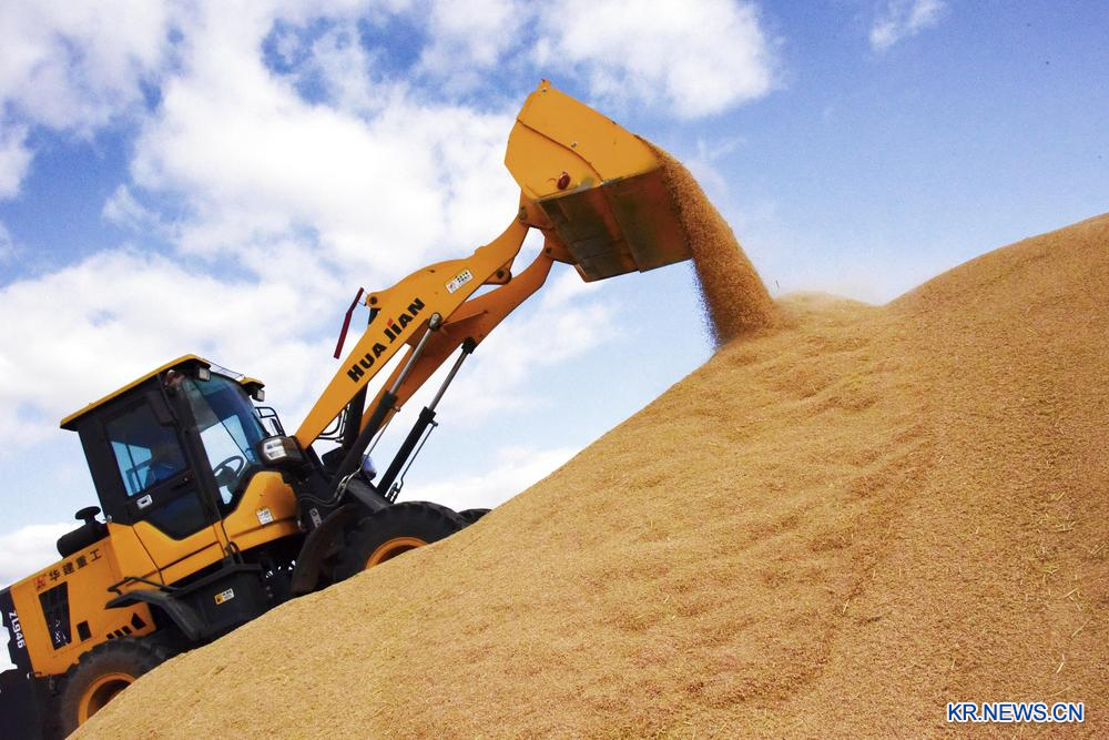 [신화망 하얼빈 10월9일] 8일 베이다황(北大荒)그룹 헤이룽장(黑龍江) 쑤이빈(綏濱)농장회사 둥징(東井) 관리구의 곡물 건조장에서 한 작업자가 기계로 수확한 벼를 쌓고 있다.