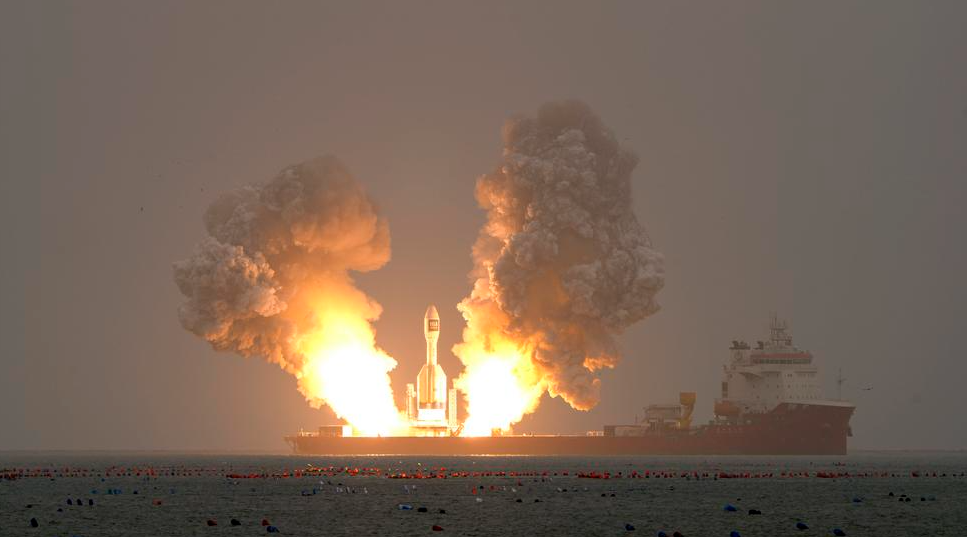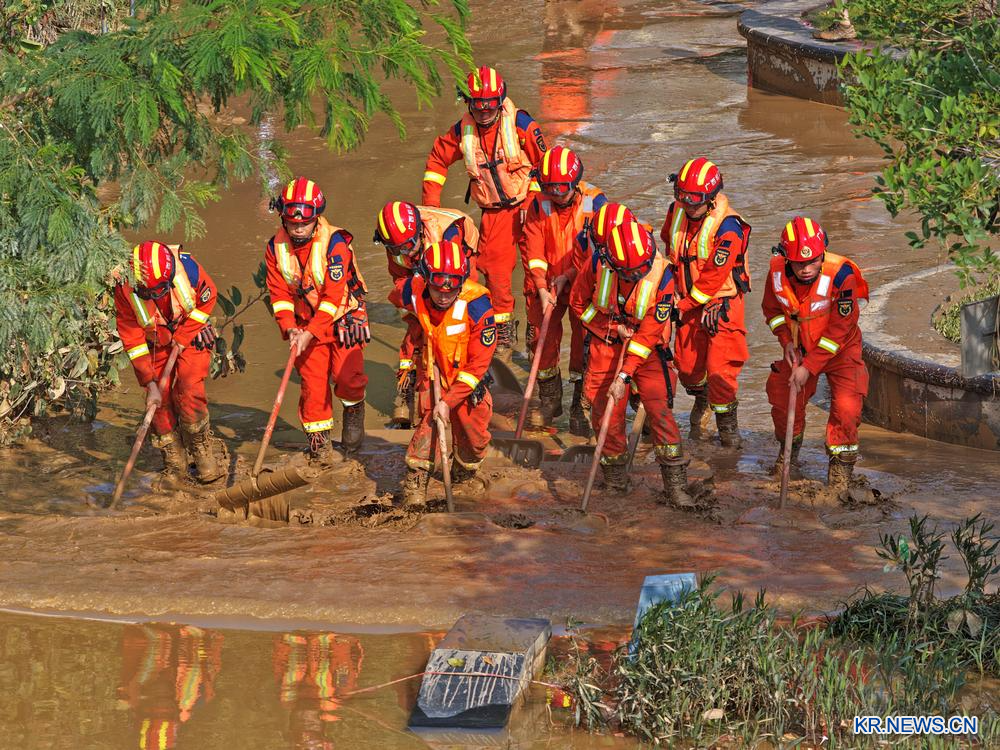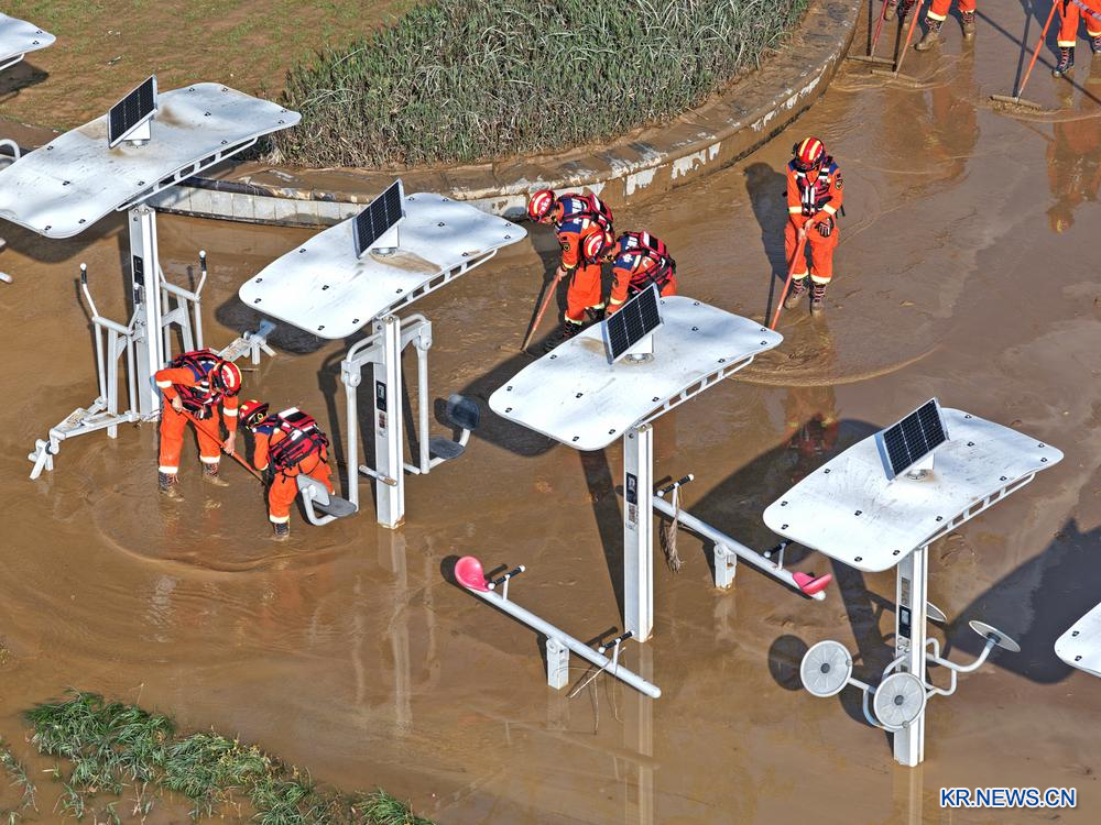 12일 위장 난닝시 도심 구간에서 준설 작업 중인 소방 구조대원을 드론으로 촬영했다. 2025.10.12
