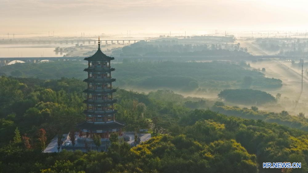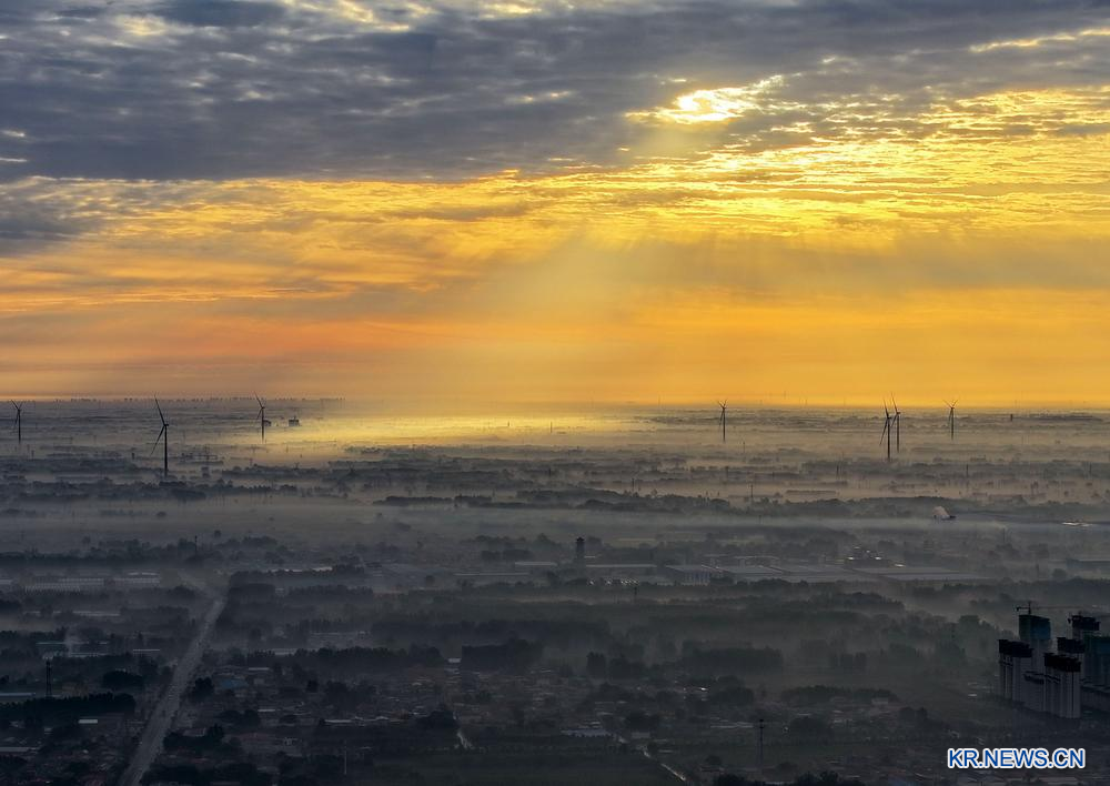 13일 새벽 안개가 드리운 허베이(河北)성 싱타이(邢臺)시 광쭝(廣宗)현을 드론으로 내려다봤다. 2025.10.13