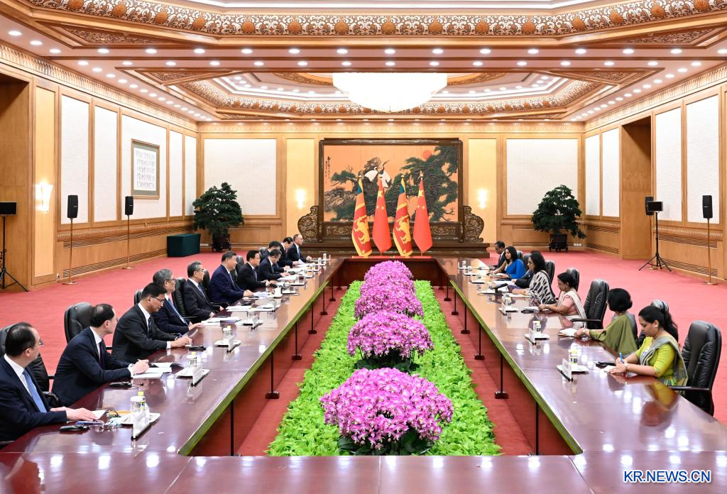 시진핑(習近平) 중국 국가주석이 14일 오전 베이징 인민대회당에서 글로벌 여성 서밋 참석차 중국을 방문한 하리니 아마라 수리야 스리랑카 총리와 회견했다. [촬영/신화사 기자 선훙(申宏)]