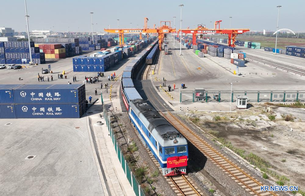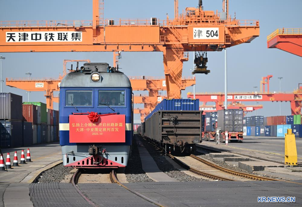 이날 톈진-중앙아시아 정기 열차의 첫 발차 현장. 2025.10.13