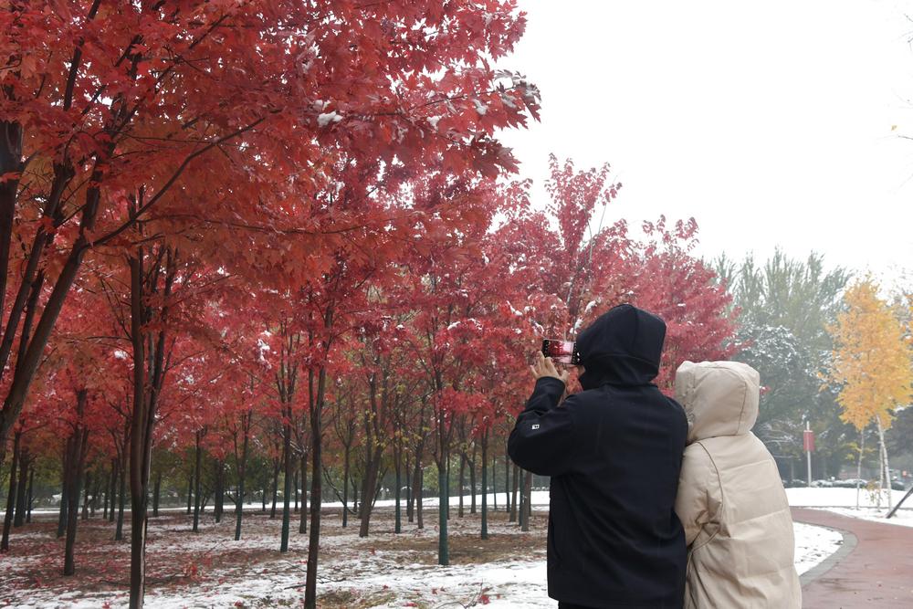 [신화망 하얼빈 10월17일] 15일 헤이룽장(黑龍江)성 쑤이화(綏化)시 시민이 눈 쌓인 거리 풍경을 휴대전화 사진에 담고 있다.