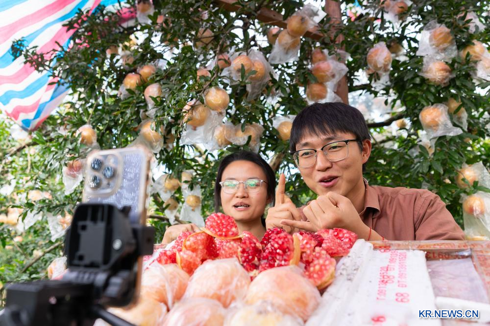 고향에 돌아와 창업에 뛰어든 대학생 우하이타오(吳海濤·오른쪽)가 지난 15일 현지 농민과 함께 라이브방송을 통해 멍쯔 석류를 소개하고 있다. 2025.10.17