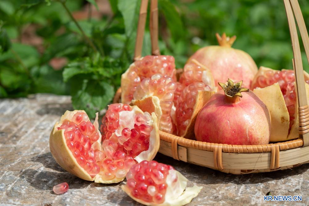 [신화망 멍쯔 10월18일] '중국 석류의 고장'이라 불리는 윈난(雲南)성 훙허(紅河)하니(哈尼)족이(彝)족자치주 멍쯔(蒙自)시는 최근 수년간 지속적으로 석류의 정밀 심가공에 주력하면서 농산물 이커머스 등 부대 산업을 발전시켰다. 또한 멍쯔 수출 농산물 종합서비스 센터를 설립해 재배부터 판매를 아우르는 전 산업사슬 순환 체계를 구축했다.