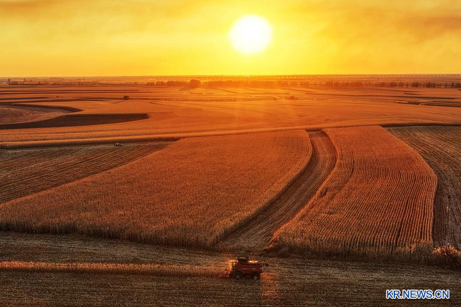 지난 14일 헤이룽장(黑龍江)성 자무쓰(佳木斯)시∙퉁장(同江)시 허저족향 농민이 저녁노을 아래서 옥수수를 수확하고 있다. (사진/신화통신)원문 출처:신화통신 한국어 뉴스 서비스