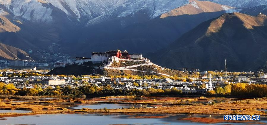 라루(拉魯) 습지에서 바라본 포탈라궁(布達拉宮). 시짱(西藏)자치구 라싸(拉薩)에 위치한 세계문화유산 포탈라궁(布達拉宮)이 가을빛으로 물든 고원과 함께 아름다운 경치를 빚어냈다. (사진/신화통신)가을날,