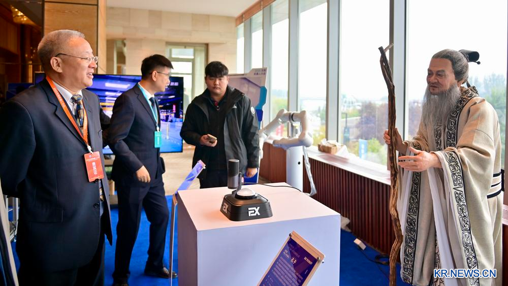 17일 한 귀빈이 인터랙티브형 휴머노이드 로봇 '공자'와 상호작용을 하고 있다. 2025.10.17