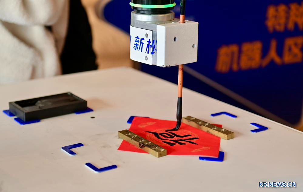 17일 '2025 선양(瀋陽) 로봇대회' 전시부스에서 스마트 로봇이 붓으로 한자 '복(福)'을 쓰고 있다.