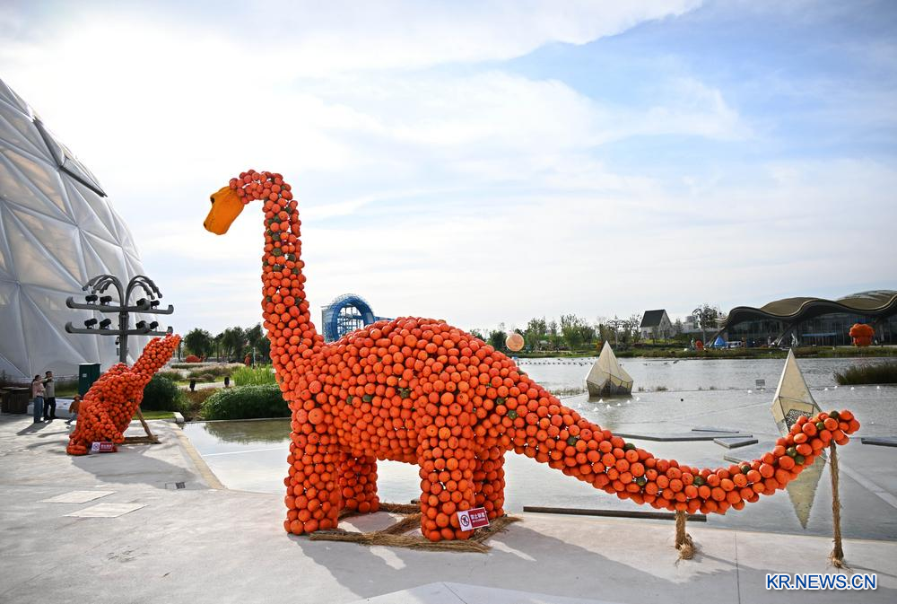 [신화망 칭다오 10월19일] 산둥(山東)성 칭다오(青島)시 동방에덴원에서 '호박 예술 왕국' 테마전이 열리고 있다. 다양한 품종과 색상의 호박으로 만든 만화 캐릭터 모양의 조형물들이 관광지 안에 설치돼 관광객들의 발길이 이어지고 있다.