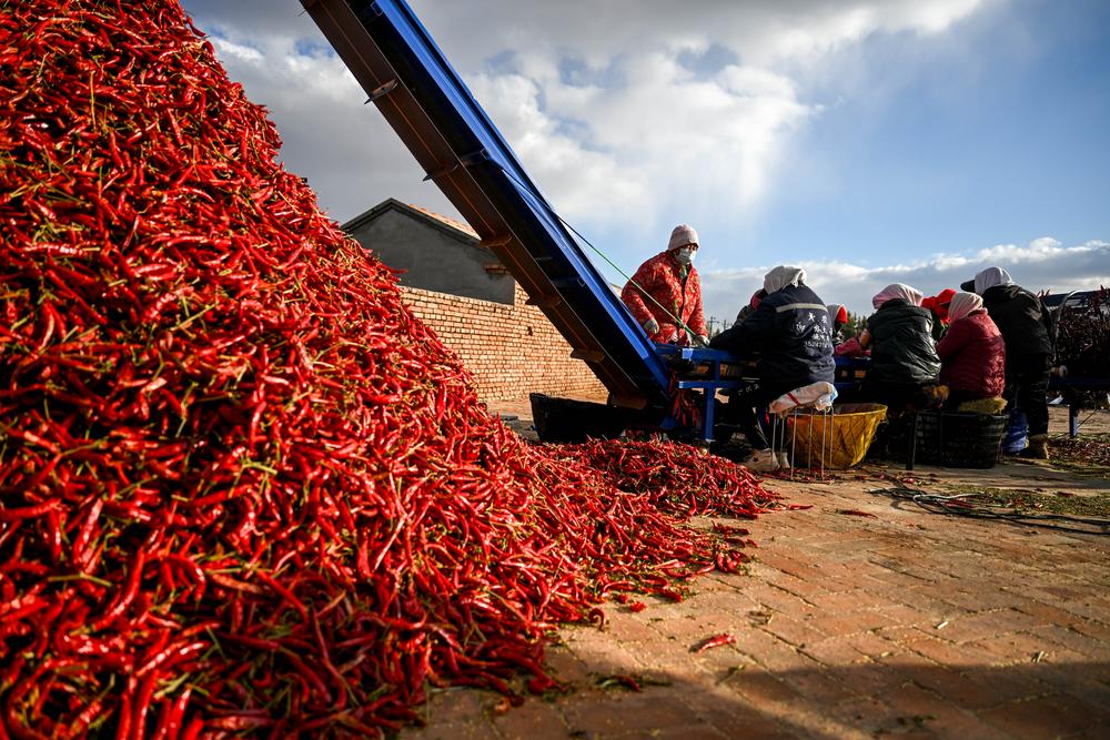 19일 네이멍구(內蒙古)자치구 퉁랴오(通遼)시 카이루(開魯)현 주민들이 붉은 건고추를 선별하고 있다.
